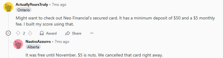 Several users were using the Neo Secured Credit, which had been free, until the issuer began charging $5 a month: