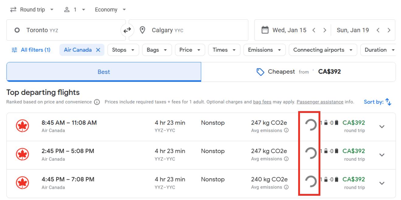 Start searching for flights like you normally would on Google Flights. We'll go through how it works with a basic flight from Toronto to Calgary on Air Canada.
