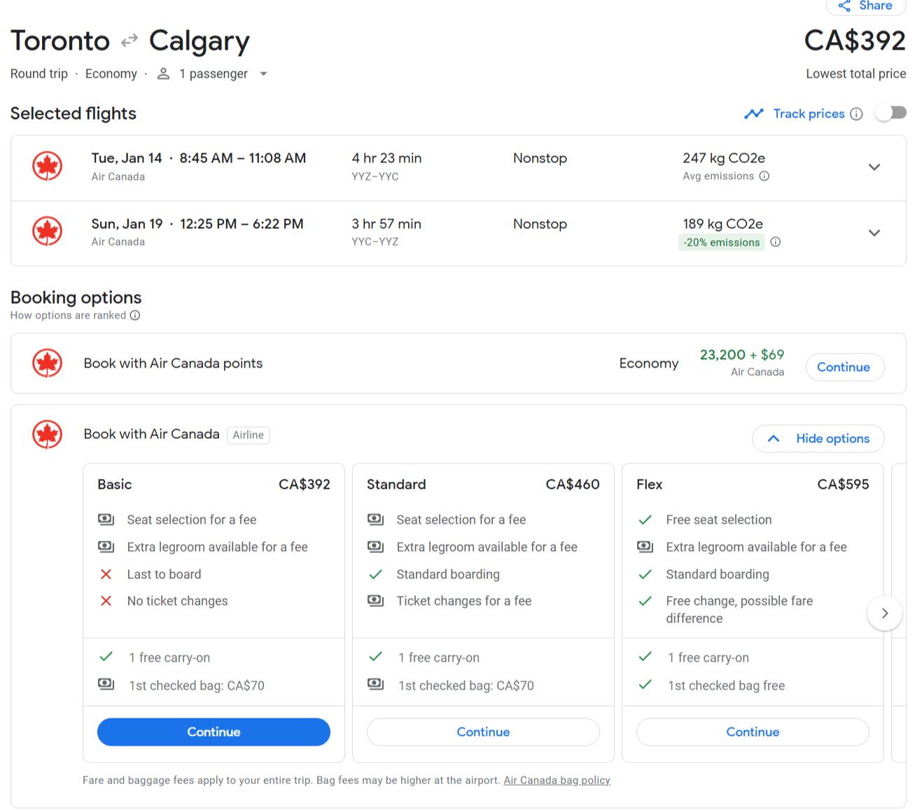 When you click continue. you'll be taken to the Air Canada search results for these flights. You’ll have to select the flight again and while this is a little inconvenient, you’ll have to sign into your Aeroplan account to book something anyway. If you have Preferred pricing, you'll see your actual offer.