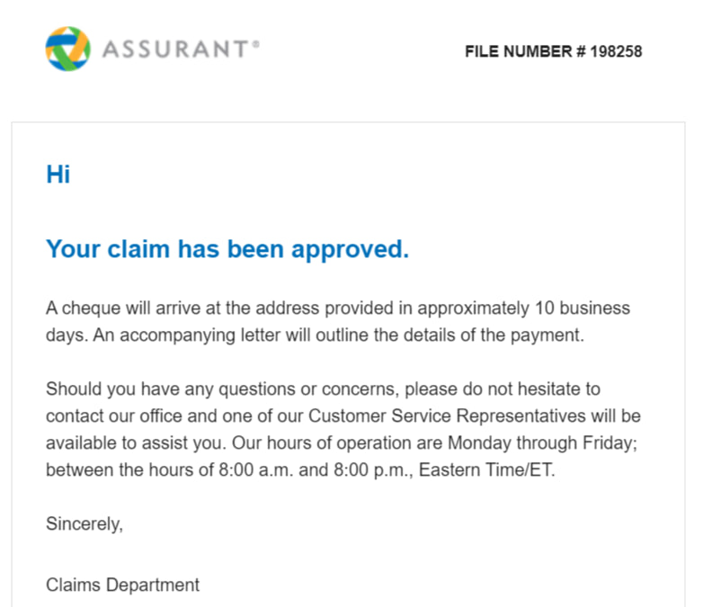 Assurant states that it takes 5 to 10 business days to process a claim, but our test shows that it can be as early as just two days later.